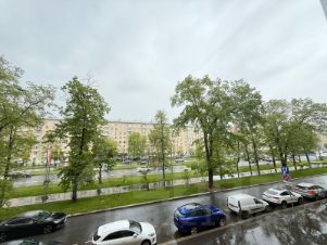 Общая площадь 54 кв.м., изолированные комнаты 21 кв.м. и 17 кв.м., кухня 11 кв.м., совмещенный санузел, просторный коридор, отдельная гардеробная комната. Потолки 3 м. Окна смотрят на Ленинский проспект (установлены стеклопакеты с повышенной шумоизоляцией). От дороги дом отделен зеленой пешеходной зоной.