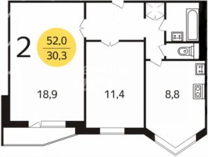 Общая площадь 51.7 м²: Просторная кухня 9.8 м², две изолированные комнаты (18.9 м² и 11.4 м²). Идеально для семьи с ребенком или пары.