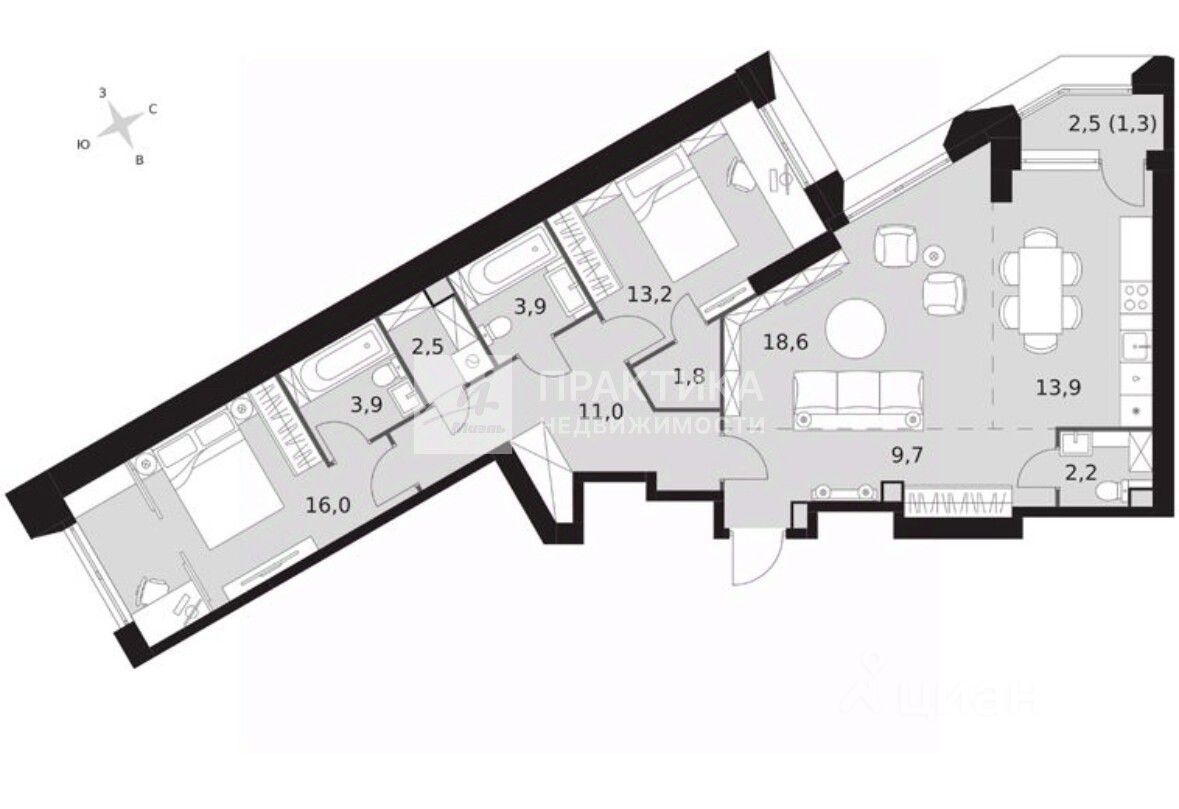 В квартире есть мастер-блок с зоной для гардеробной и санузлом. Четыре мокрые точки позволяют сделать три санузла и постирочную. Кухня площадью 18,6 кв. м станет любимым местом для семейных ужинов и дружеских посиделок.