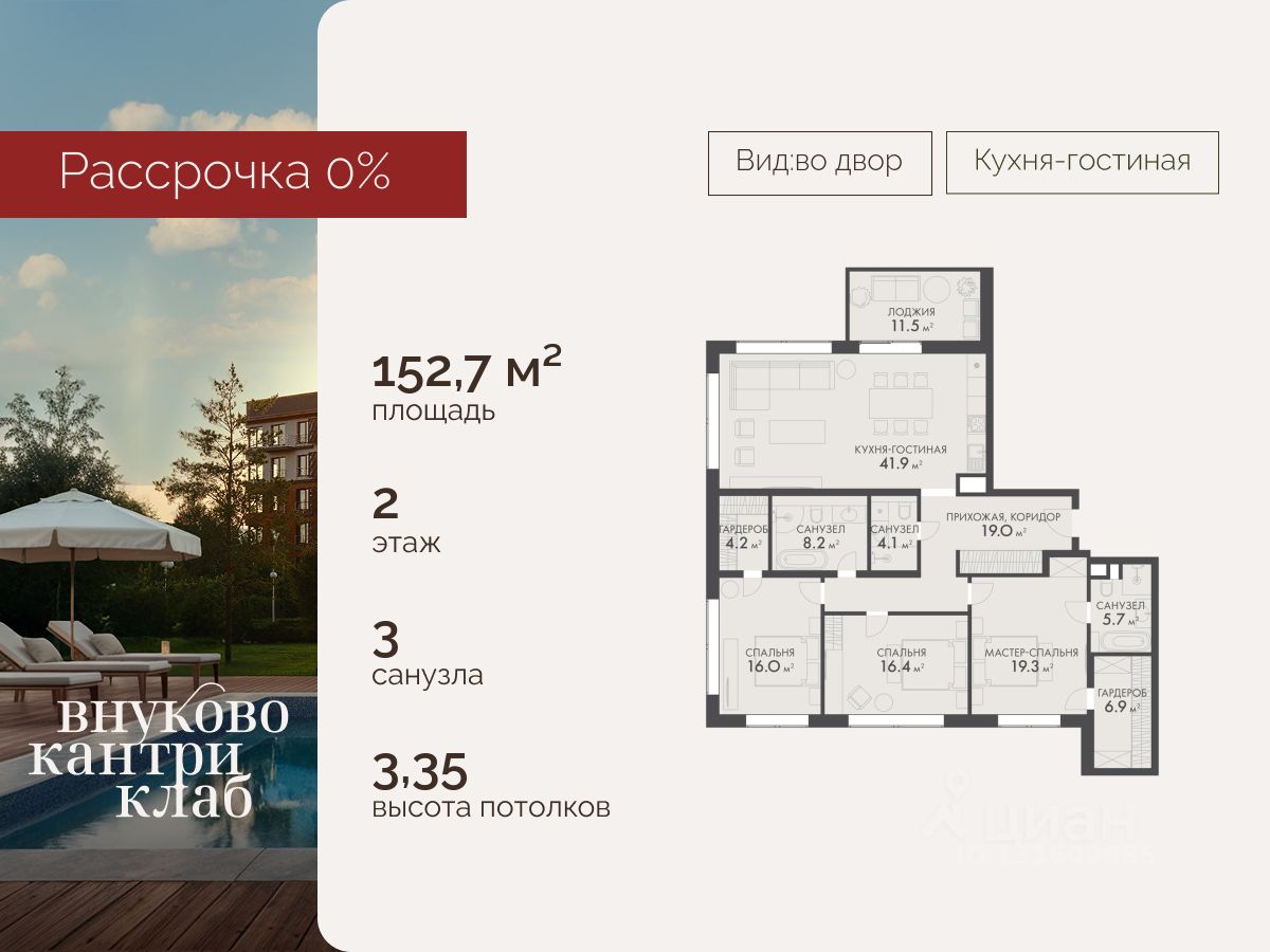 Продается видовая квартира (площадь - 152.70 кв. м., комнат - 4, этаж 2) в клубном поселке премиум-класса Vnukovo Country Club. Комплекс расположен на Западе Москвы в экологически-чистом районе в окружении Ульяновского и Валуевского лесопарков.