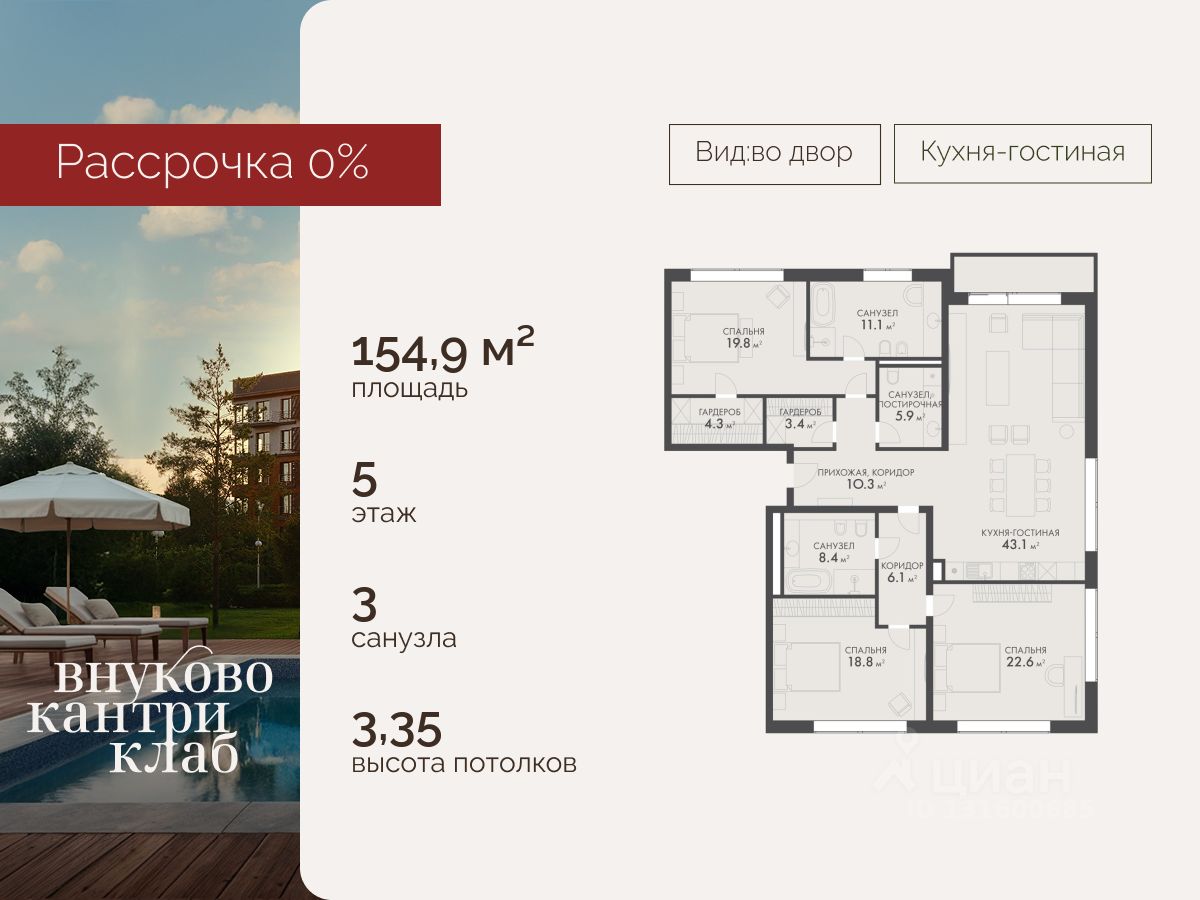 Продается видовая квартира (площадь - 154.90 кв. м., комнат - 4, этаж 5) в клубном поселке премиум-класса Vnukovo Country Club. Комплекс расположен на Западе Москвы в экологически-чистом районе в окружении Ульяновского и Валуевского лесопарков.