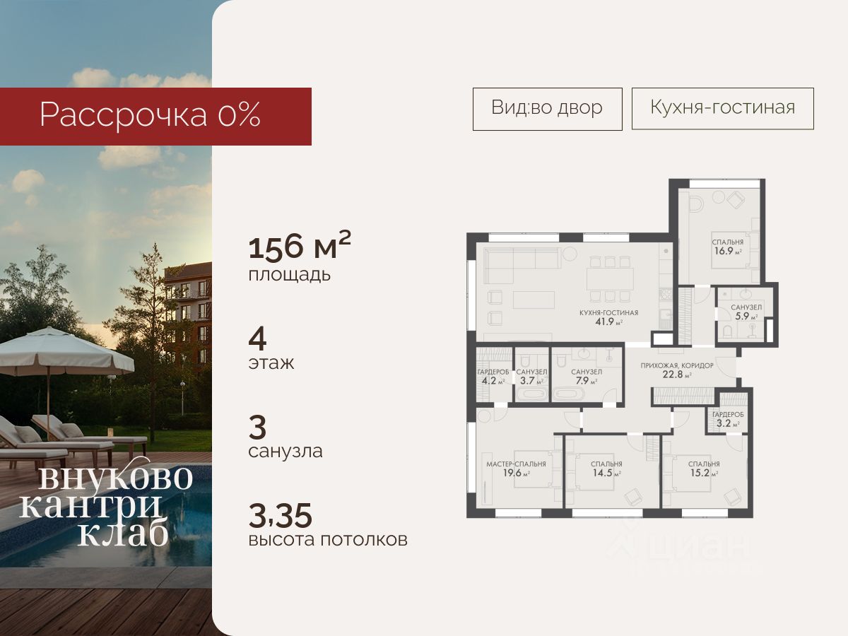 Продается видовая квартира (площадь - 156.00 кв. м., комнат - 4, этаж 4) в клубном поселке премиум-класса Vnukovo Country Club. Комплекс расположен на Западе Москвы в экологически-чистом районе в окружении Ульяновского и Валуевского лесопарков.