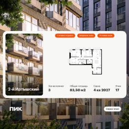 Продаётся 3-комн. квартира площадью 83,5 кв.м на 17 этаже 26 этажного дома (Корпус 1.5, Секция 5) проекта ПИК 2-й Иртышский. Светлый просторный подъезд на уровне земли, функциональная планировка, большие окна, c отделкой.