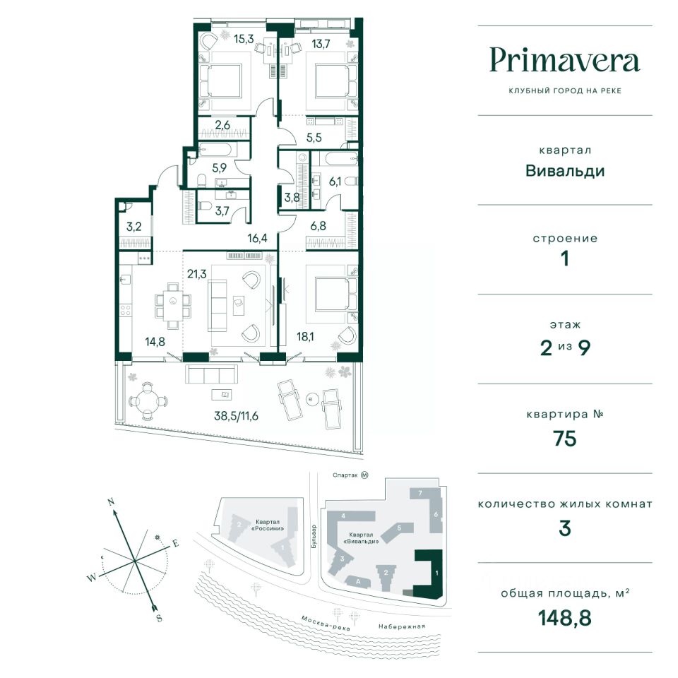 Клубный город на реке Primavera — это современный жилой комплекс премиум-класса, расположенный на первой береговой линии Москвы-реки в экологически чистом районе Покровское-Стрешнево. Под панорамными окнами квартир находится собственный экопарк с продуманной сетью прогулочных дорожек и современными детскими и спортивными площадками. За парком расположена набережная с собственным пляжем и зонами для отдыха. Клубный город на реке Primavera предлагает широкий выбор планировок для различных жизненных сценариев: от просторных однокомнатных квартир до пентхаусов и жилых помещений с террасами и патио. Выберите из 120 вариантов эргономичных планировок стандартного и евроформата. Из каждой квартиры открываются красивые виды на реку с углом обзора в 270 градусов. Дизайнерские лобби предлагают панорамный обзор на благоустроенный двор. Высокие потолки в 6 метров и качественная отделка создают атмосферу, схожую с пятизвездочными отелями. В Primavera есть всё необходимое для комфортной жизни в мегаполисе: • Образование для детей в шаговой доступности: 4 школы, 8 детских садов и развивающие центры с кружками и секциями. • Удобства на расстоянии приятной прогулки: супермаркеты, кафе, рестораны с верандами, салоны красоты, аптеки и многофункциональный центр для шоппинга и развлечений. • Умный дом: автоматизированное бесконтактное управление основными системами доступа и безопасности через мобильное приложение. Клубный город на реке Primavera выгодно сочетает комфорт городской жизни с близостью к природе. Живите в месте, где все создано для вашего удобства!