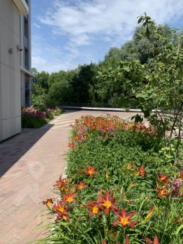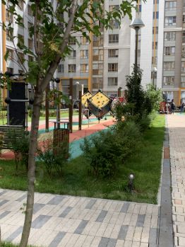 Во дворе ,многочисленные детские площадки, спорт площадки, двор с красивыми деревьями и цветами.