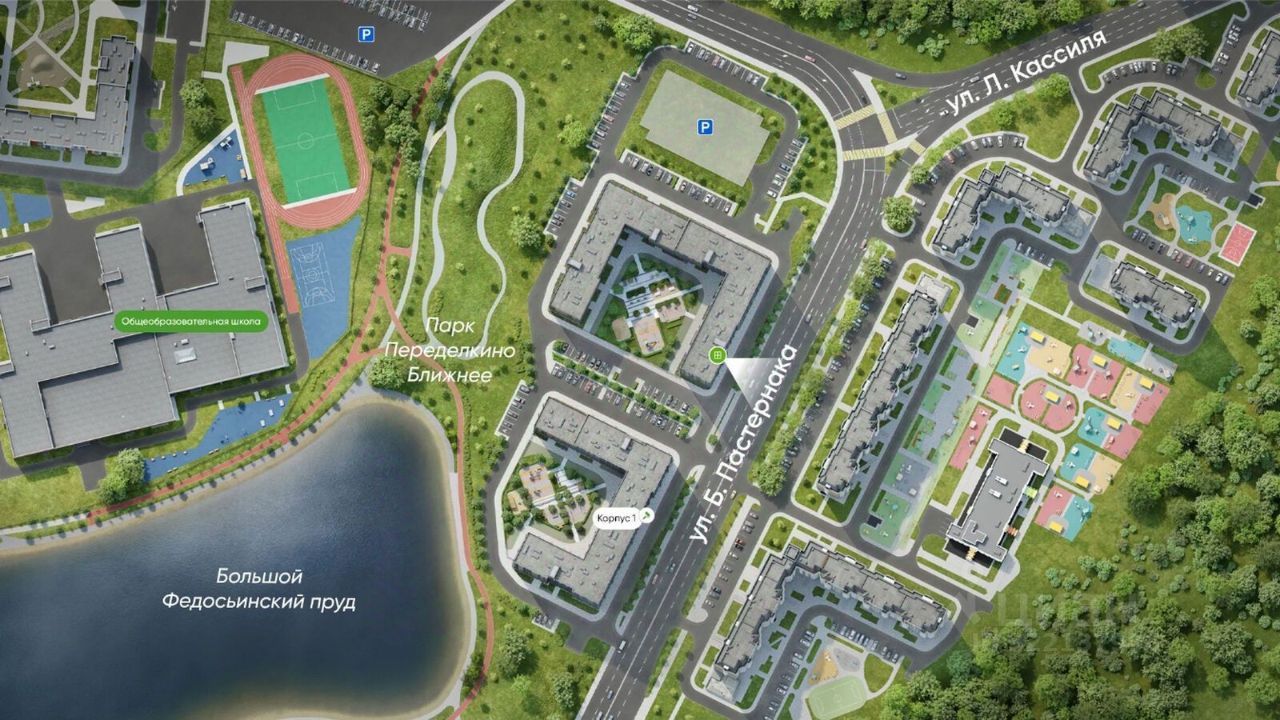 13 квартал имеет уникальное расположение и находится непосредственно на берегу Федосьинского пруда, который является сердцем города-парка "Переделкино Ближнее".