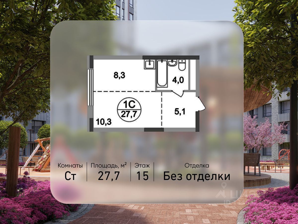 Общая площадь квартиры - 27,7 кв. м, этаж 15 из 17.