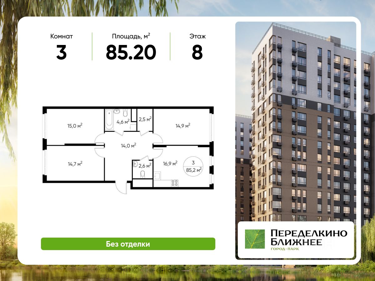 Общая площадь квартиры - 85,2 кв. м, этаж 8 из 17.