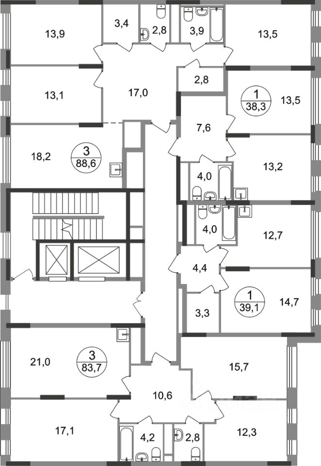 Общая площадь квартиры - 88,6 кв. м, этаж 3 из 17.