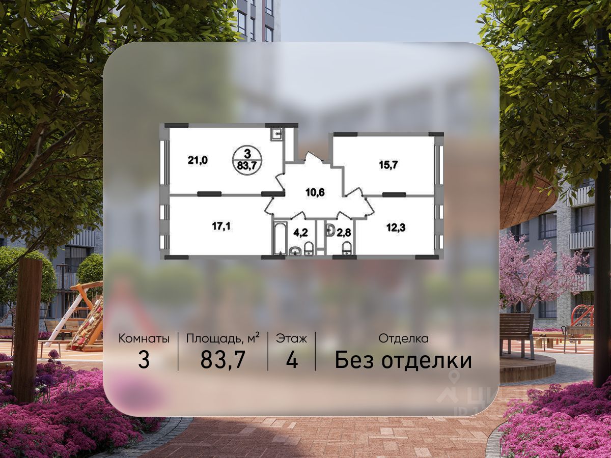 Общая площадь квартиры - 83,7 кв. м, этаж 4 из 17.