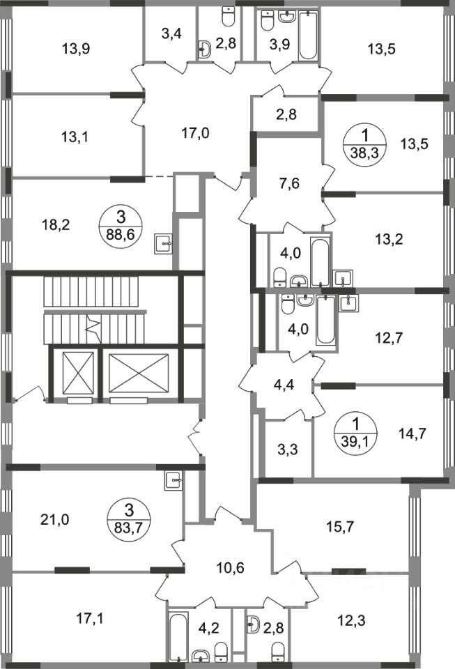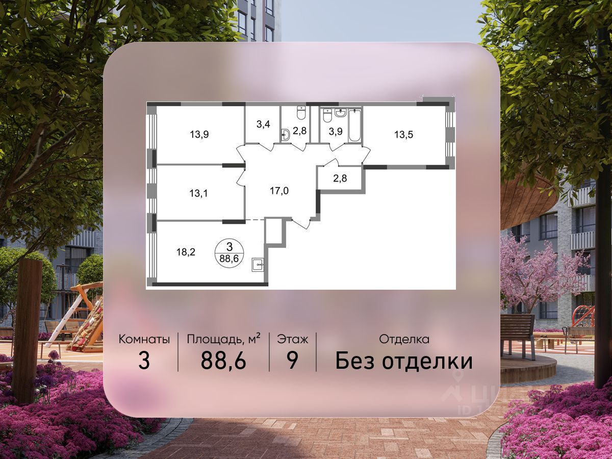 Общая площадь квартиры - 88,6 кв. м, этаж 9 из 17.