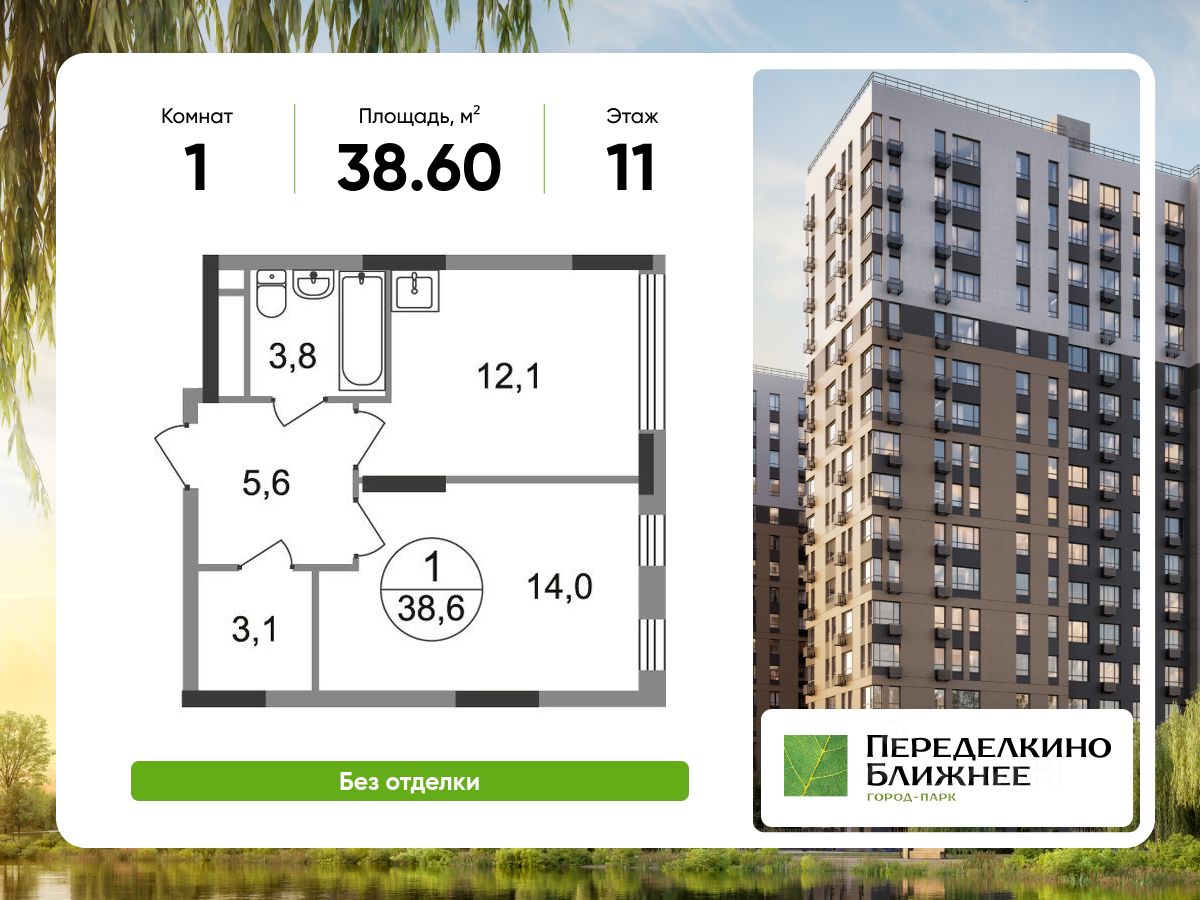 Общая площадь квартиры - 38,6 кв. м, этаж 11 из 17.