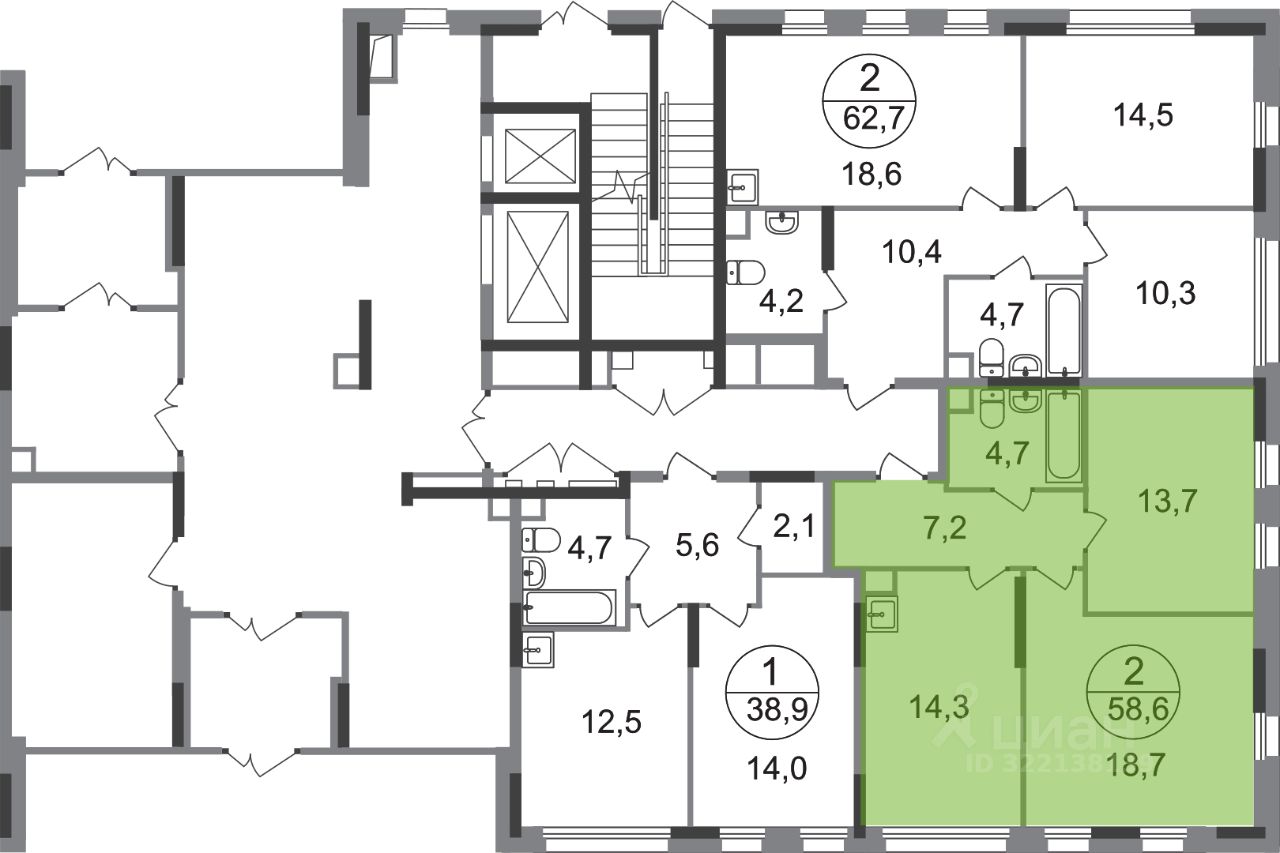 Общая площадь квартиры - 58,6 кв. м, этаж 1 из 17.