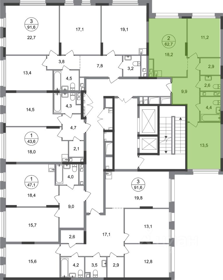 Общая площадь квартиры - 62,7 кв. м, этаж 2 из 17.