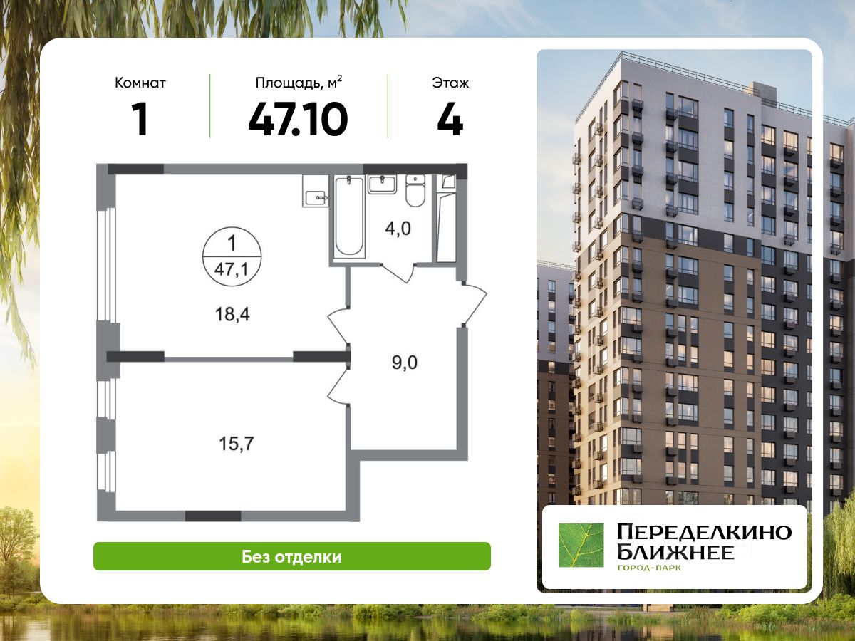 Общая площадь квартиры - 47,1 кв. м, этаж 4 из 17.