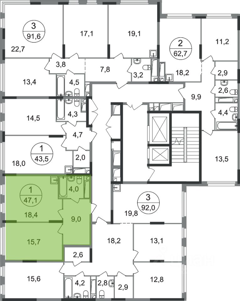 Общая площадь квартиры - 47,1 кв. м, этаж 6 из 17.