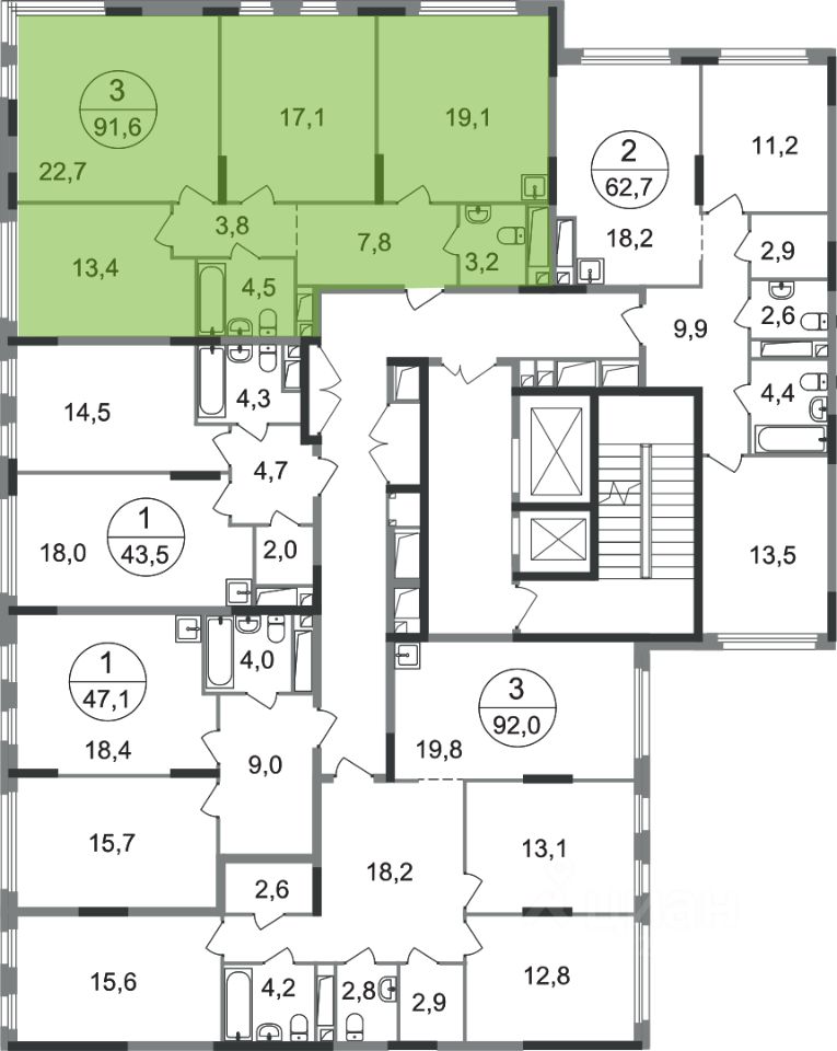 Общая площадь квартиры - 91,6 кв. м, этаж 10 из 17.