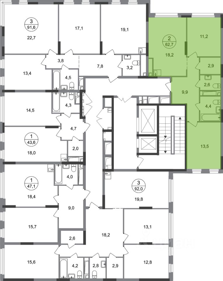 Общая площадь квартиры - 62,7 кв. м, этаж 11 из 17.