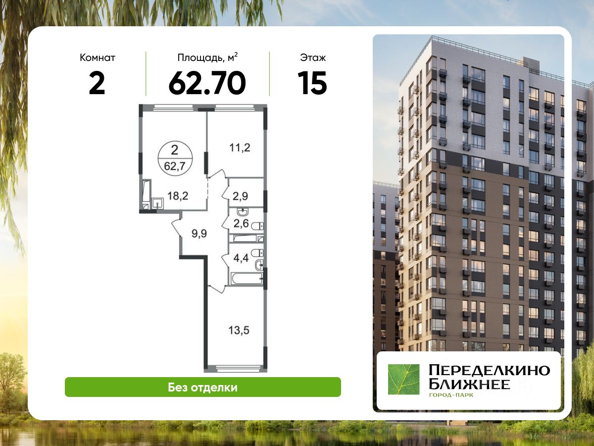 Общая площадь квартиры - 62,7 кв. м, этаж 15 из 17.