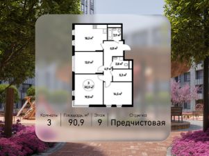 Общая площадь квартиры - 90,9 кв. м, этаж 9 из 17.