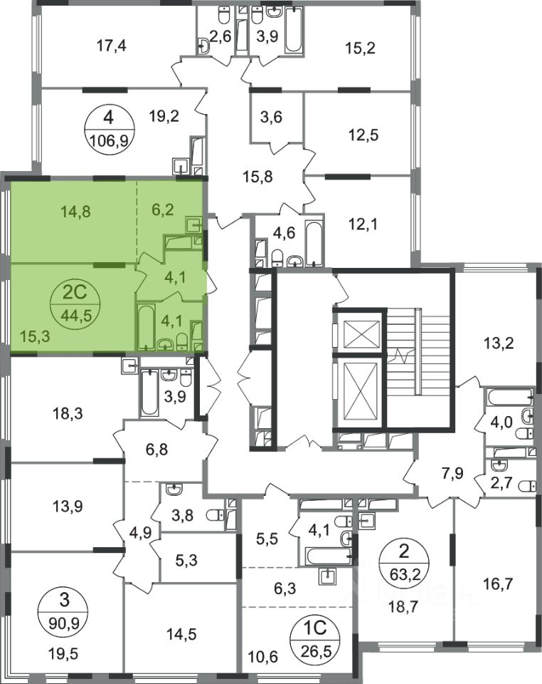 Общая площадь квартиры - 44,5 кв. м, этаж 13 из 17.