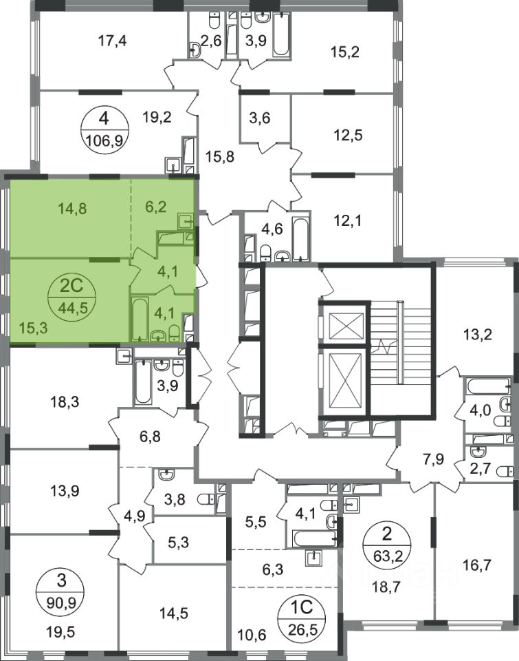 Общая площадь квартиры - 44,5 кв. м, этаж 15 из 17.