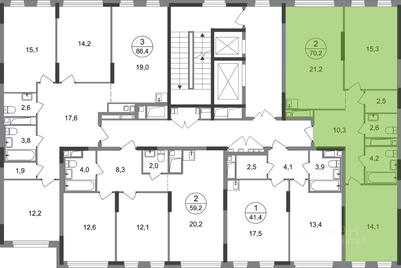 Общая площадь квартиры - 70,2 кв. м, этаж 4 из 17.