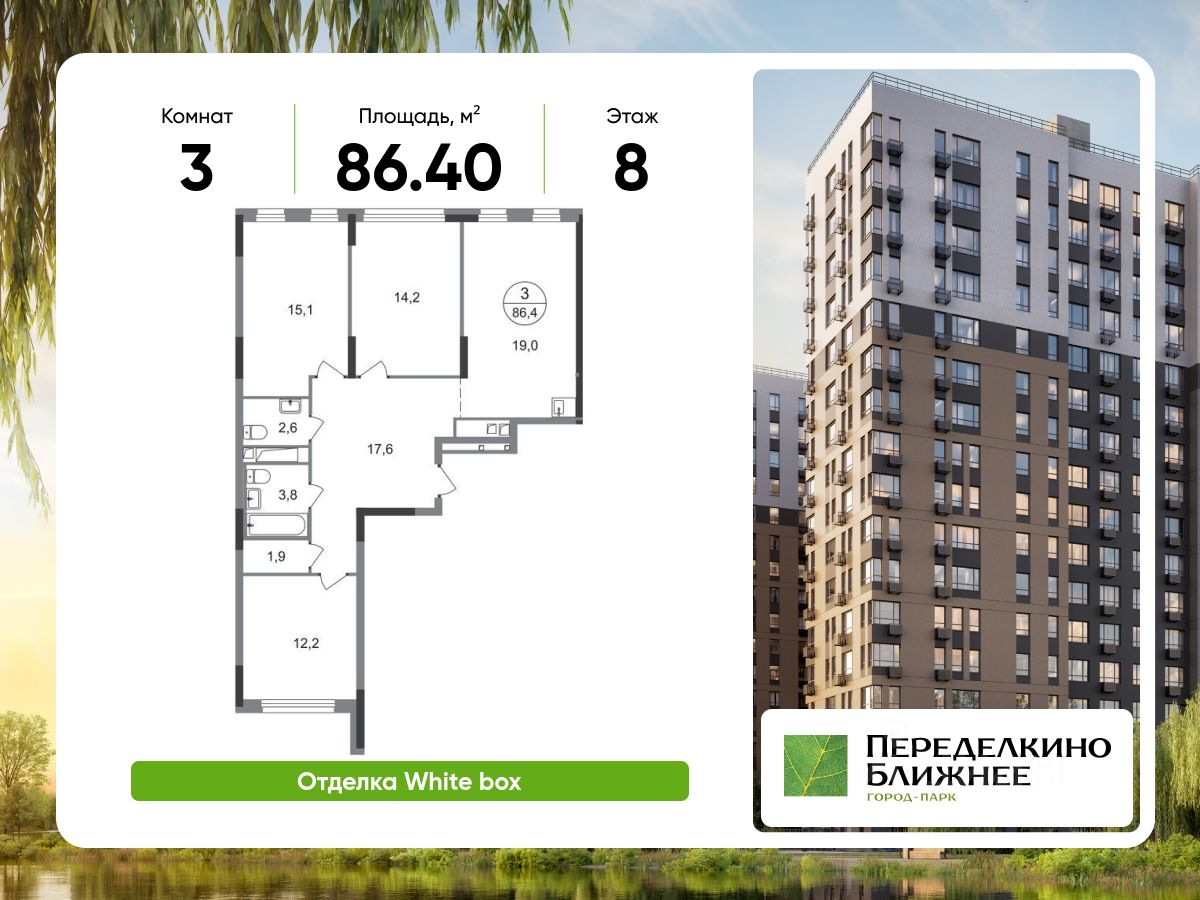 Общая площадь квартиры - 86,4 кв. м, этаж 8 из 17.