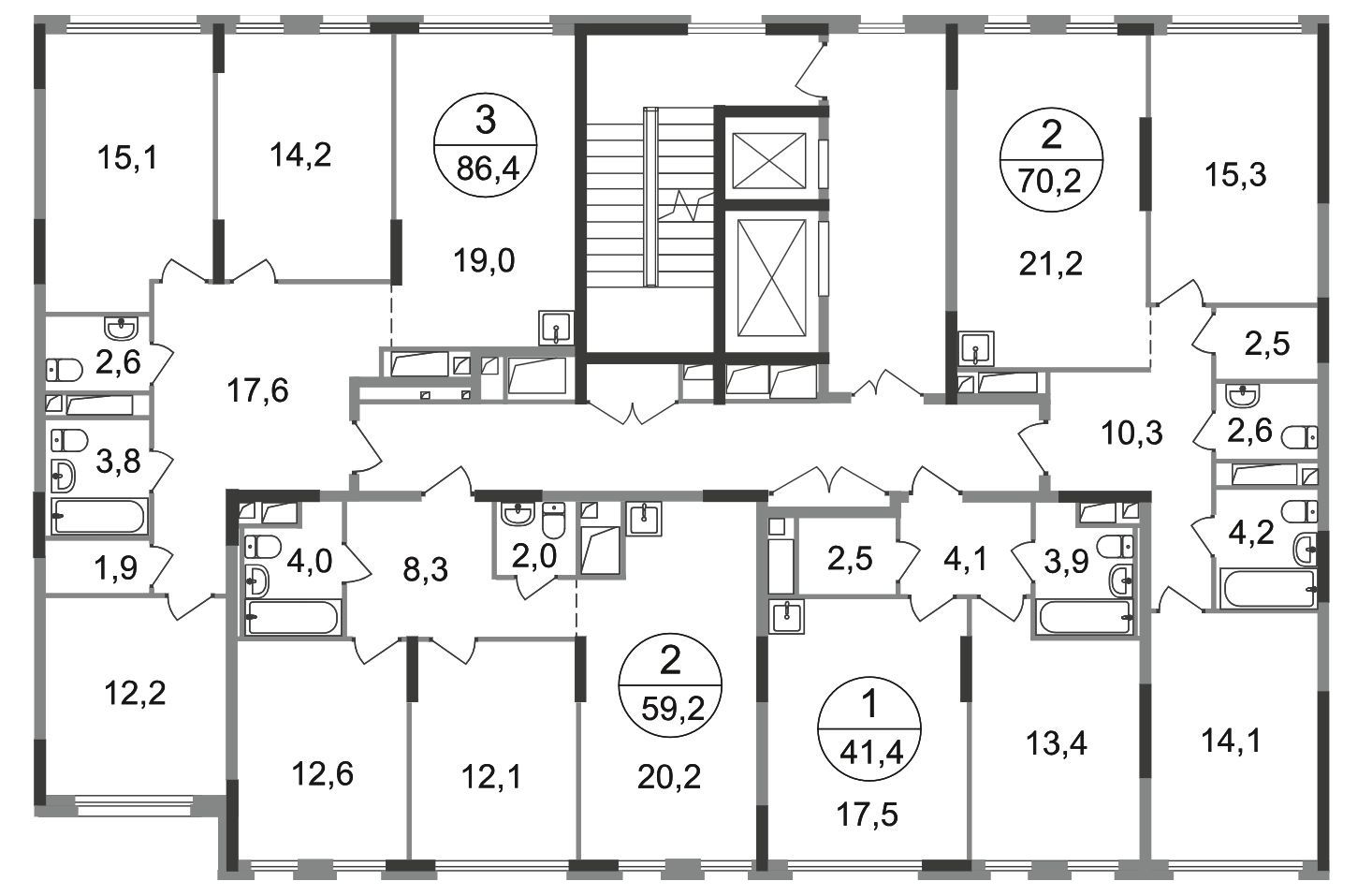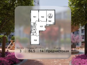 Общая площадь квартиры - 86,5 кв. м, этаж 14 из 17.