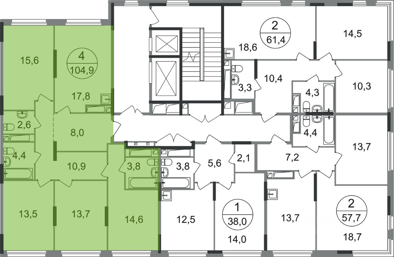 Общая площадь квартиры - 104,9 кв. м, этаж 13 из 17.