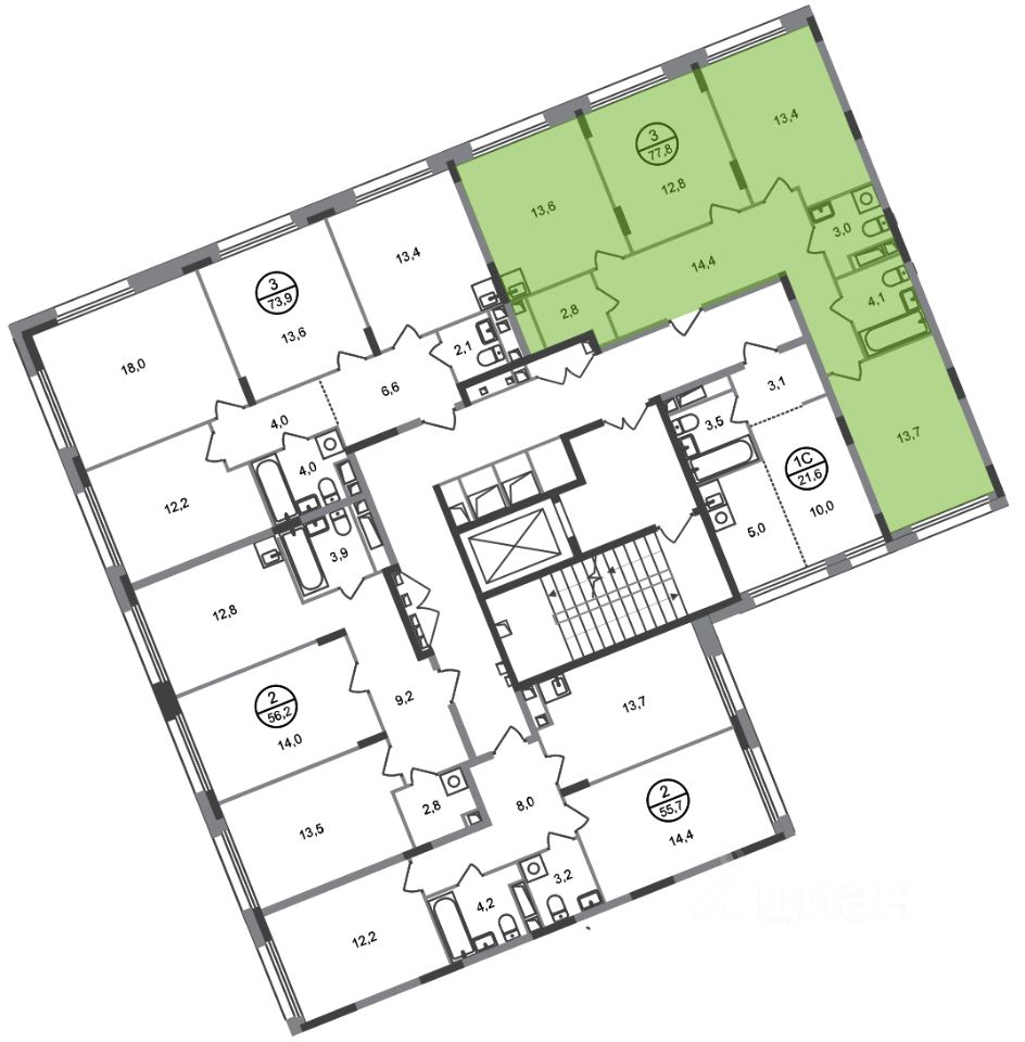 Общая площадь квартиры - 77,8 кв. м, этаж 6 из 17.