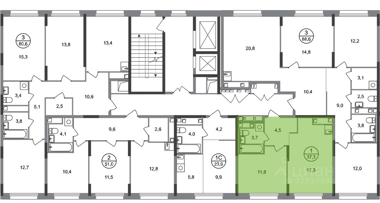 Общая площадь квартиры - 37,3 кв. м, этаж 3 из 17.