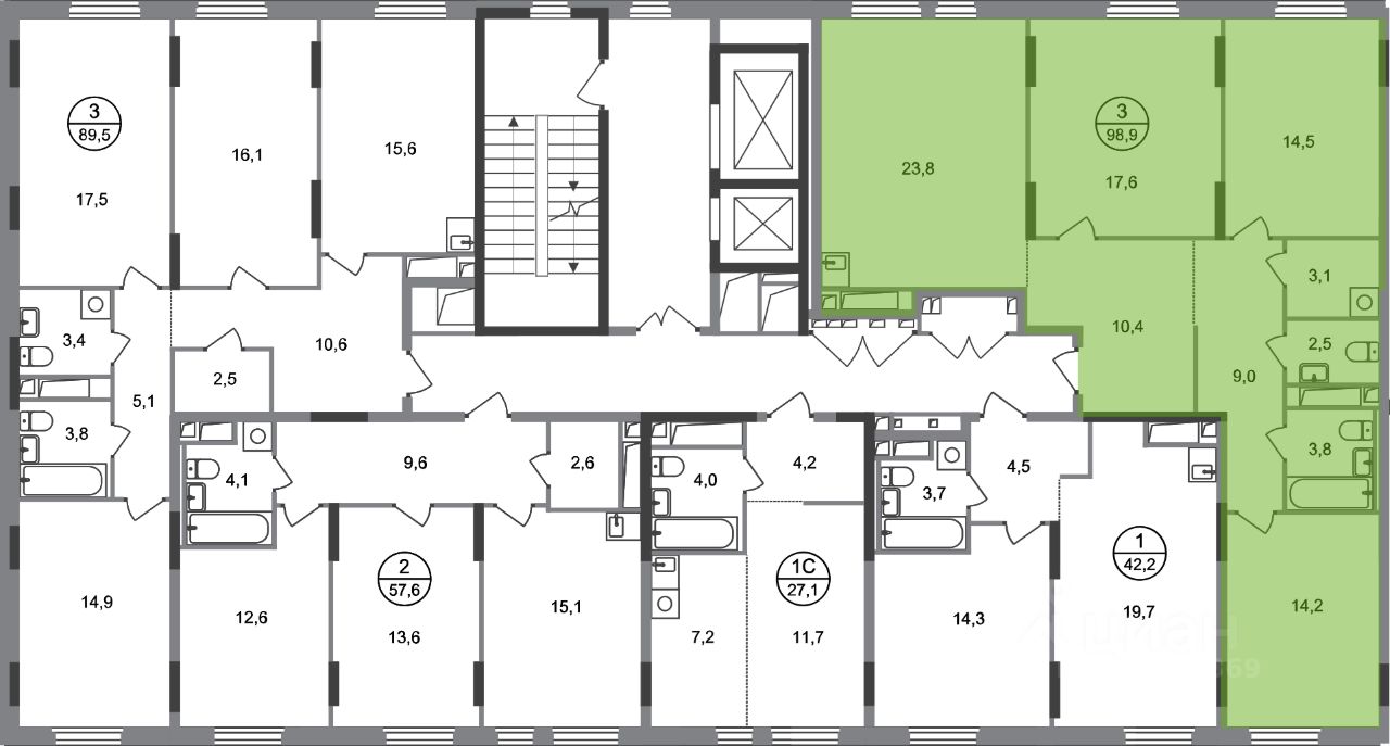 Общая площадь квартиры - 98,9 кв. м, этаж 8 из 17.