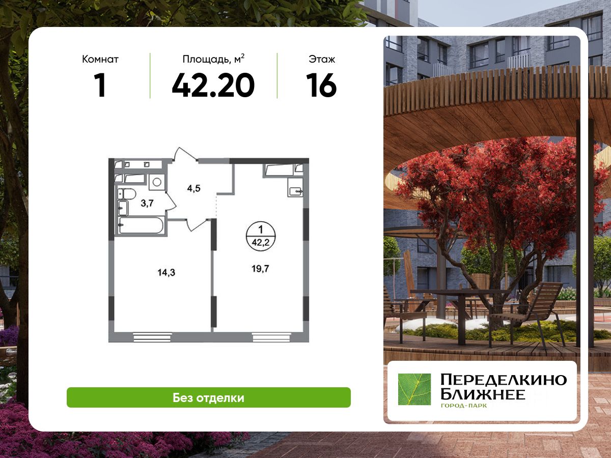Общая площадь квартиры - 42,2 кв. м, этаж 16 из 17.
