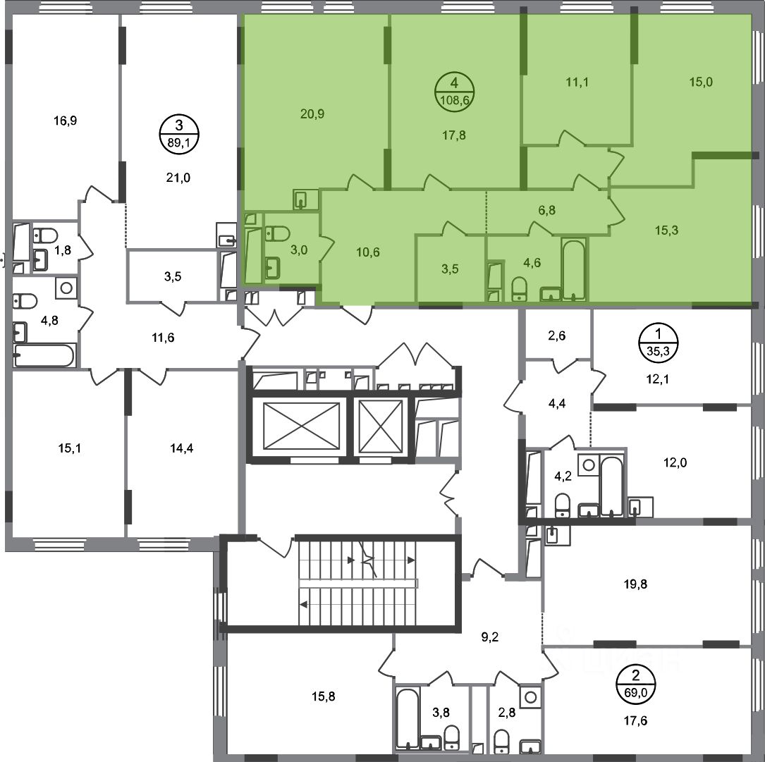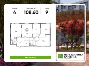 Общая площадь квартиры - 108,6 кв. м, этаж 9 из 17.