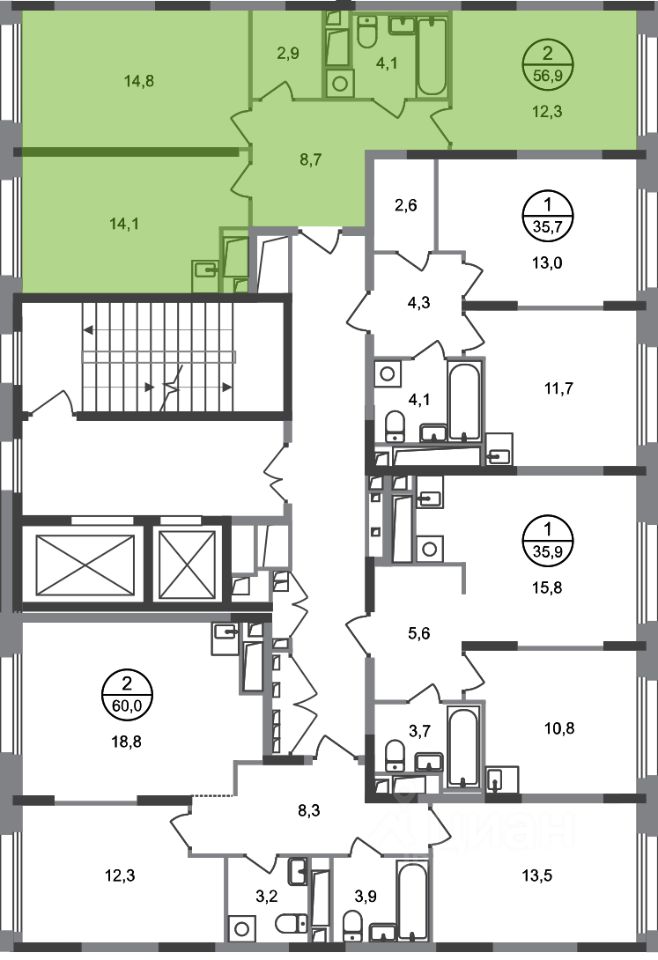 Общая площадь квартиры - 56,9 кв. м, этаж 4 из 17.
