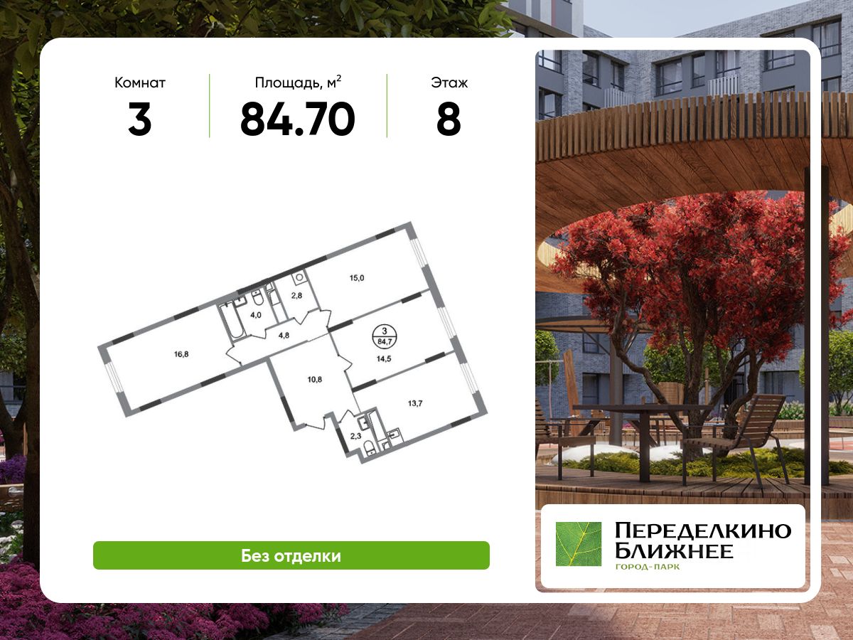 Общая площадь квартиры - 84,7 кв. м, этаж 8 из 17.