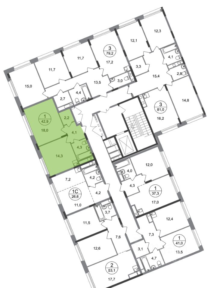 Общая площадь квартиры - 42,9 кв. м, этаж 7 из 17.
