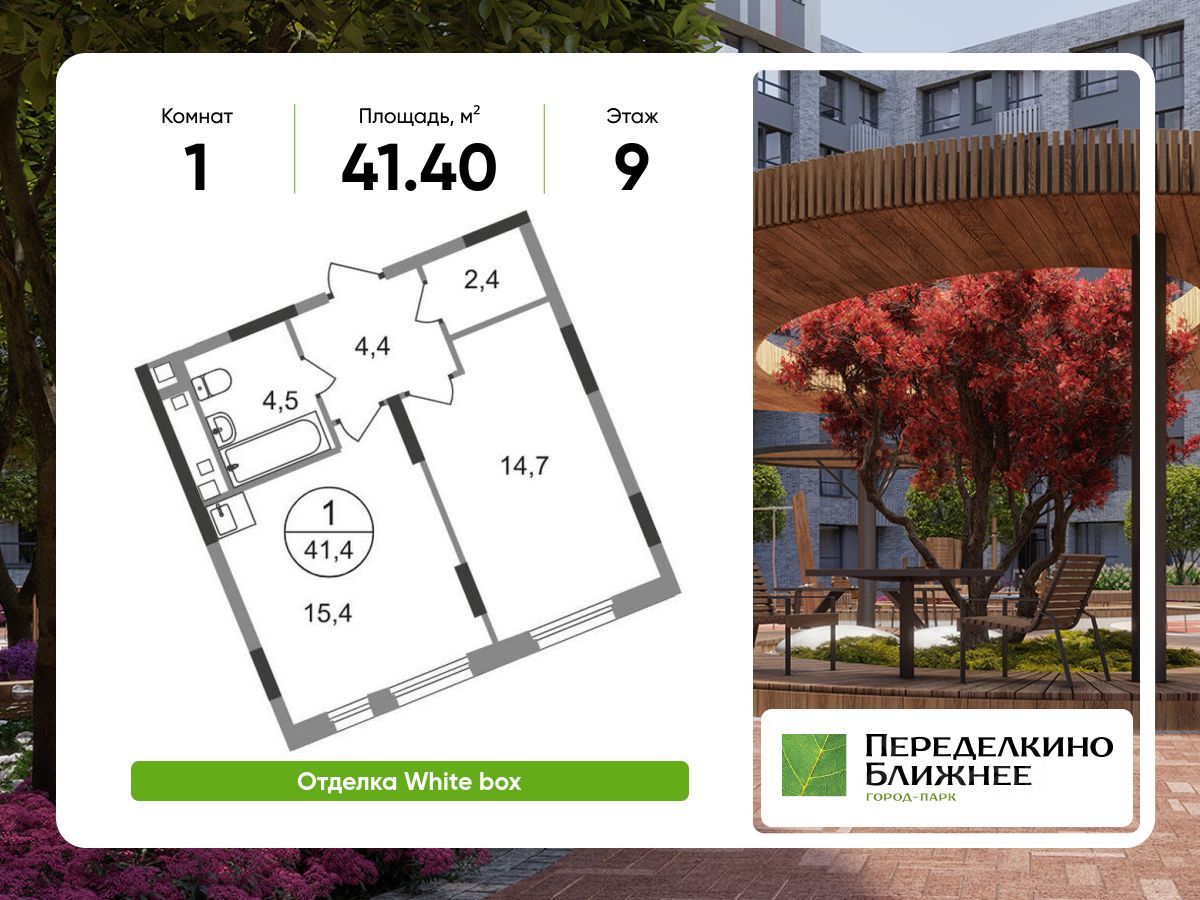 Общая площадь квартиры - 41,4 кв. м, этаж 9 из 17.