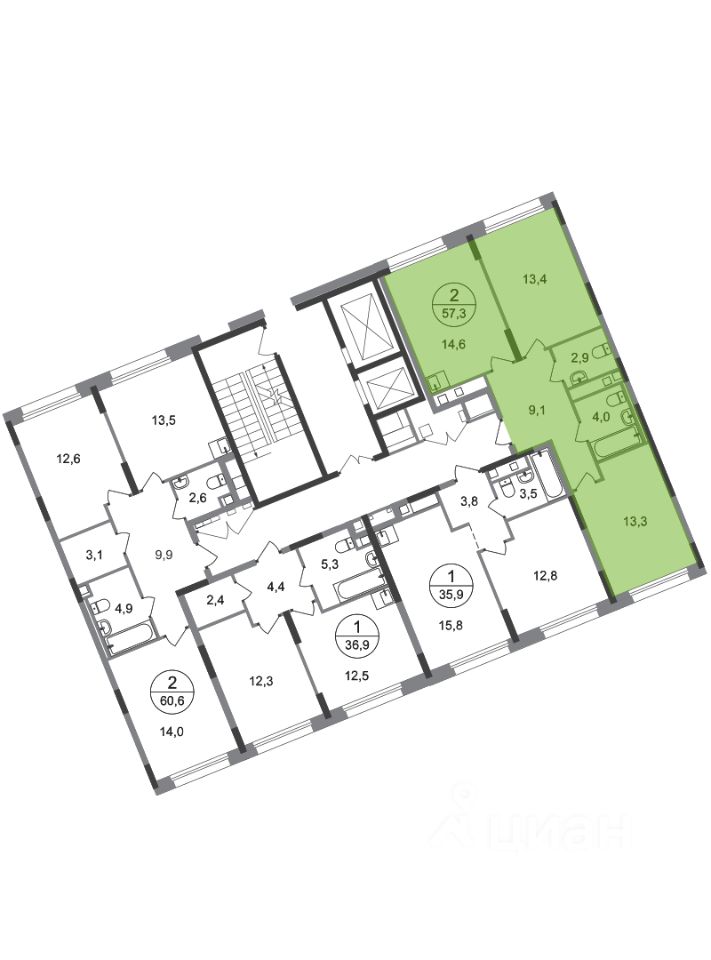 Общая площадь квартиры - 57,3 кв. м, этаж 2 из 17.