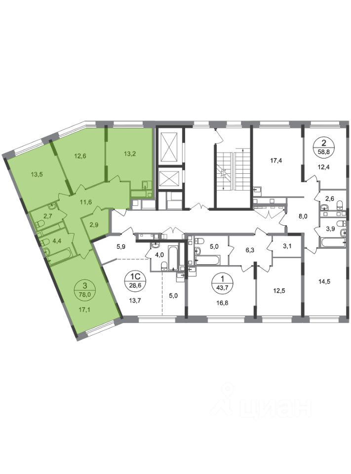 Общая площадь квартиры - 78 кв. м, этаж 3 из 17.