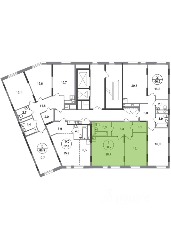 Общая площадь квартиры - 50,2 кв. м, этаж 6 из 17.