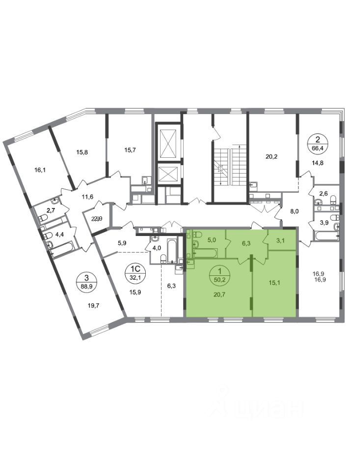 Общая площадь квартиры - 50,2 кв. м, этаж 12 из 17.