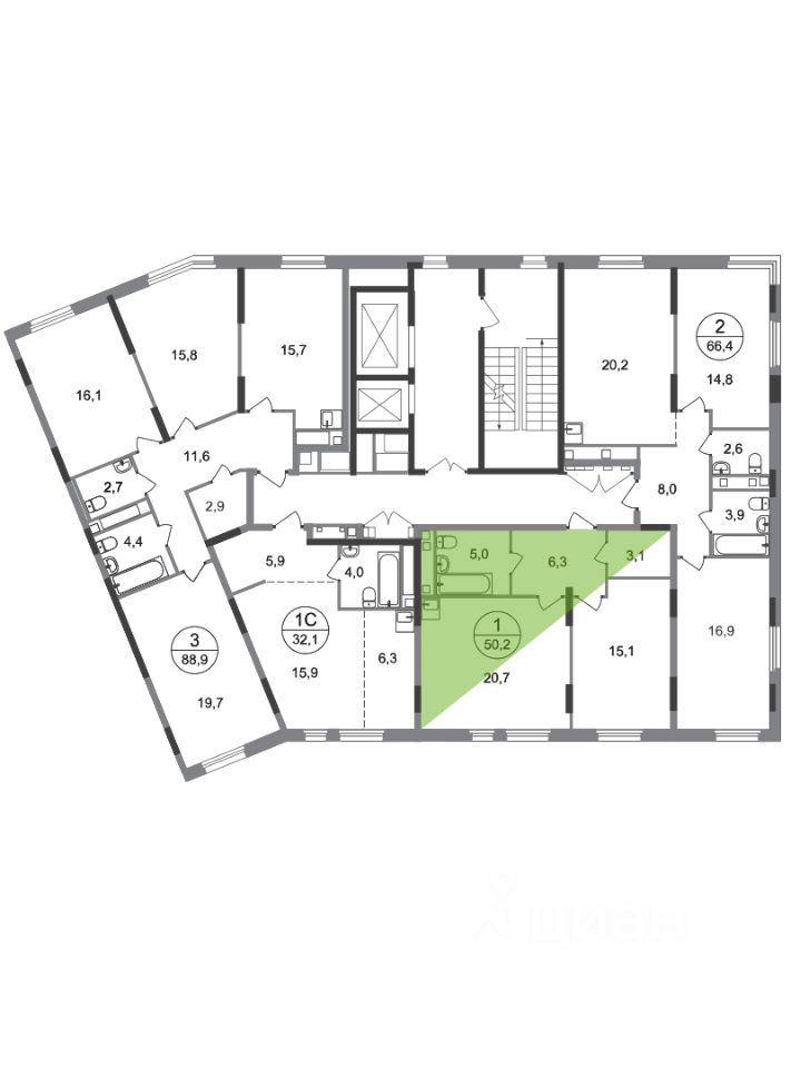 Общая площадь квартиры - 50,2 кв. м, этаж 13 из 17.