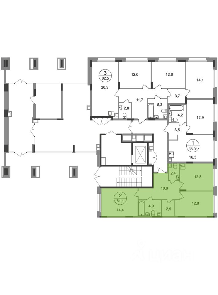 Общая площадь квартиры - 61,1 кв. м, этаж 1 из 17.