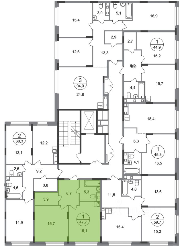 Общая площадь квартиры - 47,7 кв. м, этаж 2 из 17.