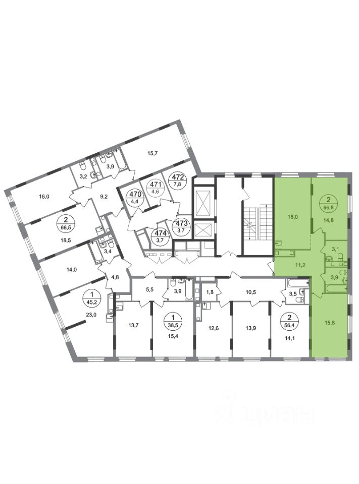 Общая площадь квартиры - 66,8 кв. м, этаж 13 из 17.