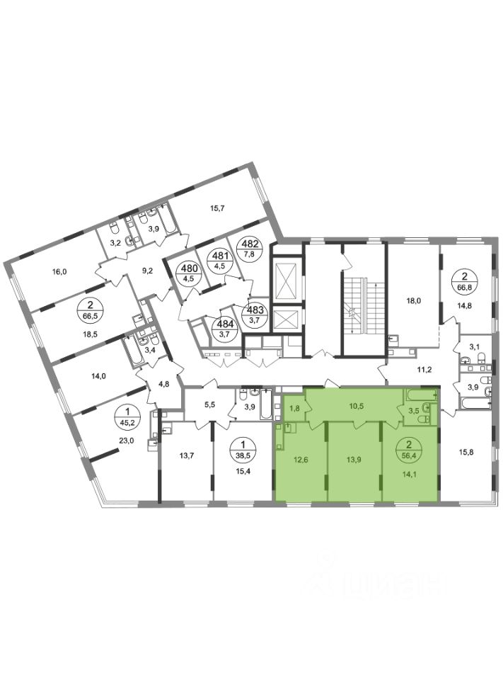 Общая площадь квартиры - 56,4 кв. м, этаж 15 из 17.