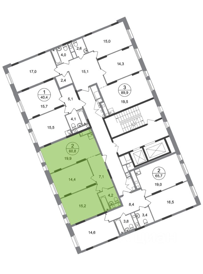 Общая площадь квартиры - 60,8 кв. м, этаж 7 из 17.