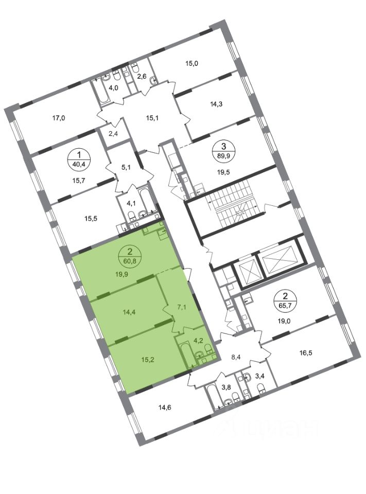 Общая площадь квартиры - 60,8 кв. м, этаж 8 из 17.